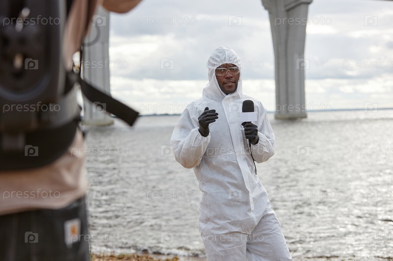 Оператор снимает новости с черным мужчиной, держащим микрофон