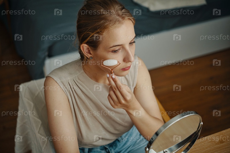 Женщина, использующая лицевой ролик в домашних условиях