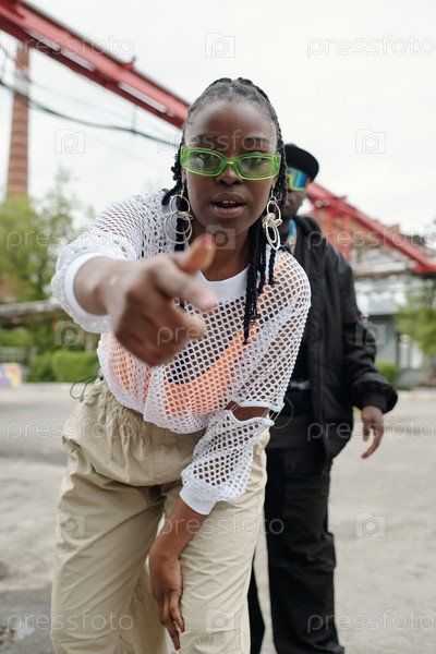Афроамериканская женщина показывает что-то на открытом воздухе, жестикулируя