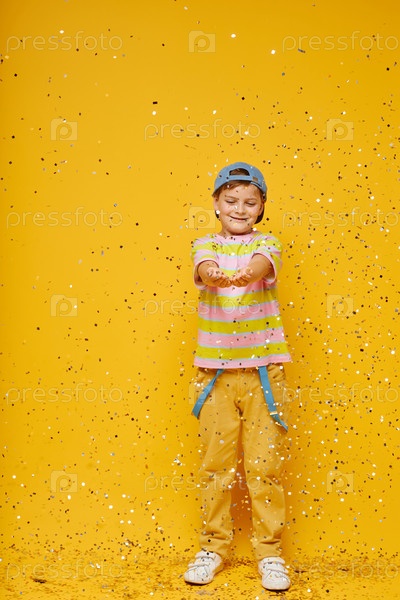 Тихо улыбающийся мальчик ловит конфетти руками, стоя в жёлтой студии