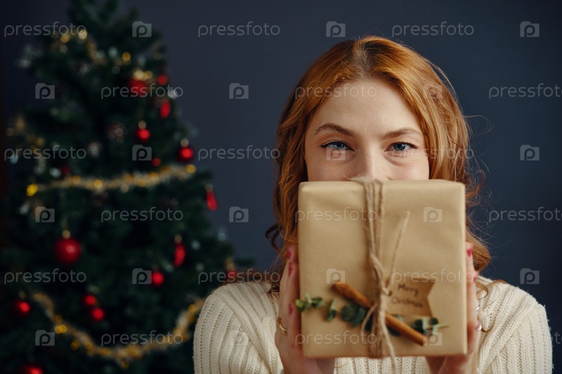 Улыбающаяся женщина держит упакованный подарок для праздничного торжества