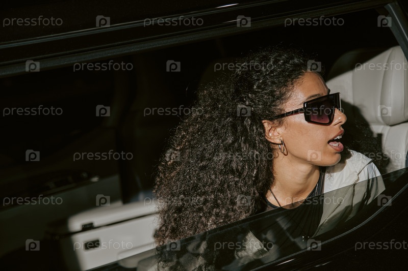 Круглая знаменитая женщина в солнцезащитных очках удивлена папарацци, сидящей на заднем сиденье машины