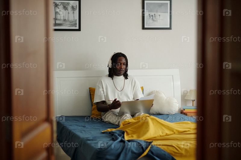Расслабление при использовании ноутбука в уютной обстановке спальни