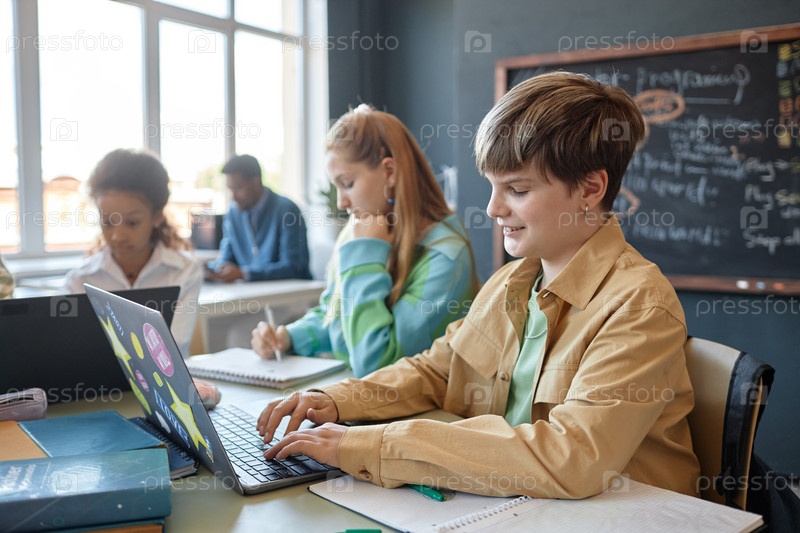 Улыбающийся мальчик использует ноутбук, наслаждаясь уроком в классе