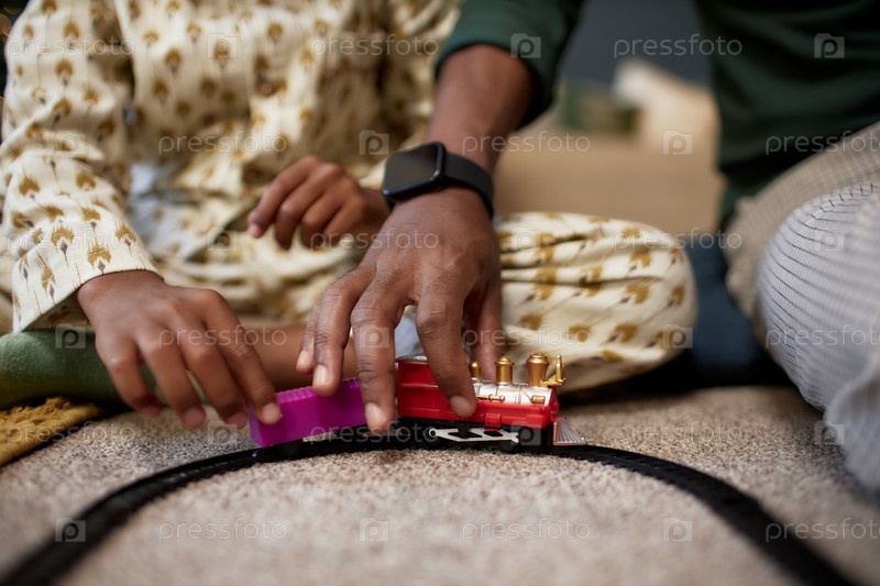 Ближайшее изображение чернокожего отца и сына, играющих с железной дорогой