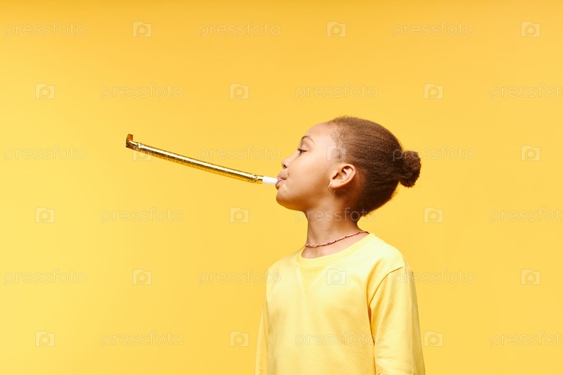 Маленькая чёрная девочка дует в свисток вечеринки, стоя на жёлтом фоне в студии
