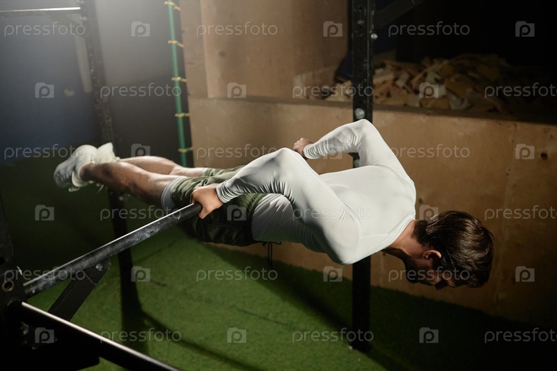 Сильный спортсмен на заднем рычаге делает вытяжки, работая на высоком баре в тренажерном зале