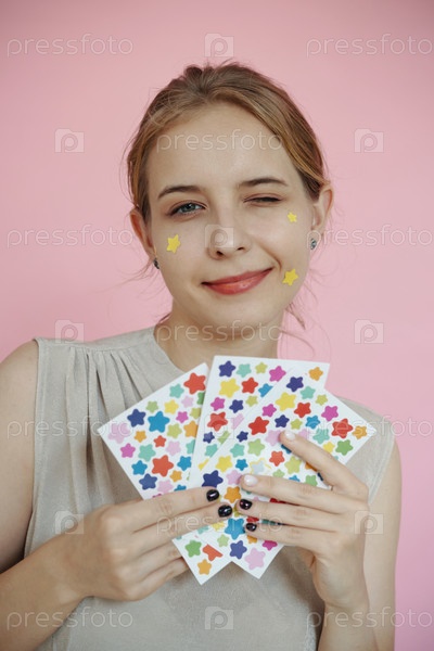 Портрет женщины, держащей красочные звездные наклейки