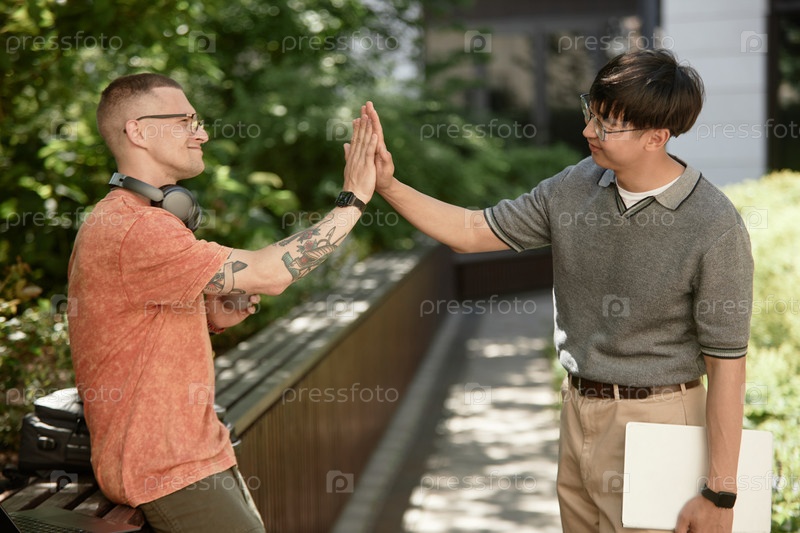 Программист дает партнеру высокую пятерку Мужчина празднует сделку во время встречи в парке
