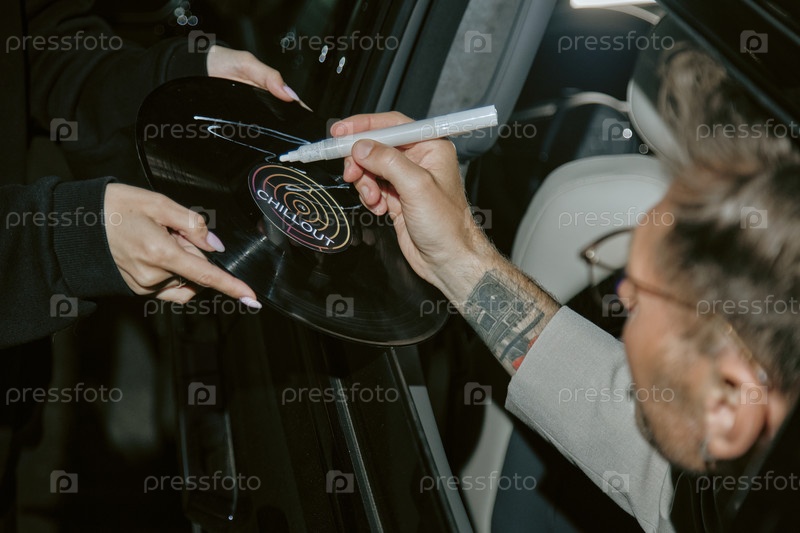 Рука мужского музыканта знаменитость подписывает виниловую пластинку, сидящая в машине