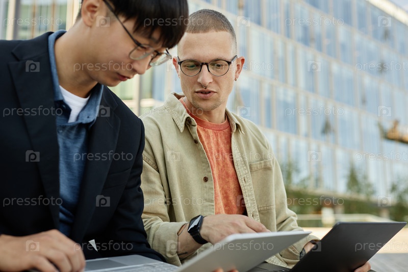 ИТ-программист помогает коллеге, указывая на экран ноутбука Работает на открытом воздухе Мужчина