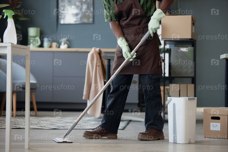 Черный человек чистит офис и стирает полы с мопом и ведрой