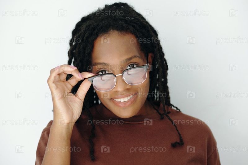Портрет улыбающейся женщины, регулирующей очки и смотрящей на камеру