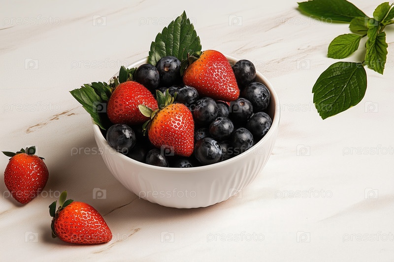 Свежие ягоды в белой миске на мраморной поверхности