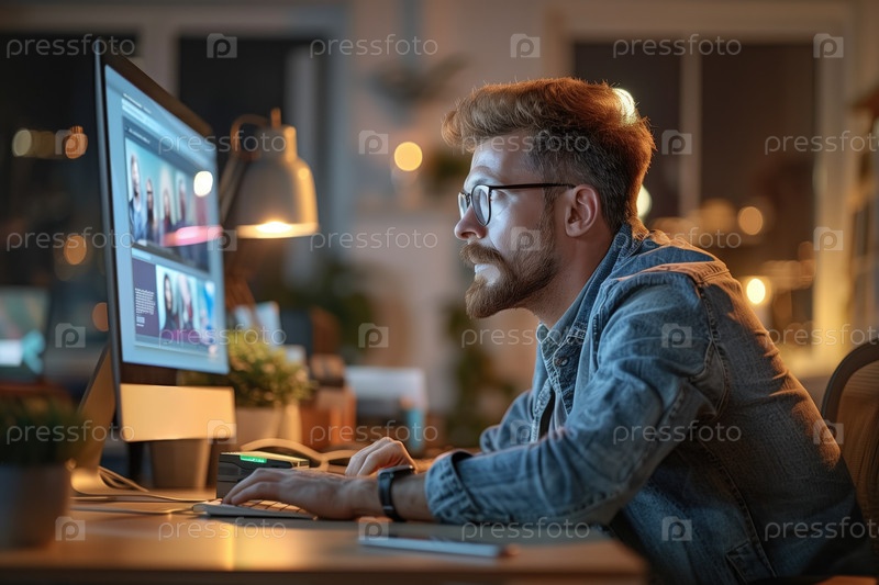 Концентрирующийся человек, работающий на компьютере в домашнем офисе