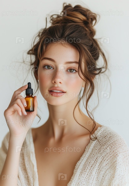 Портрет молодой женщины, держащей бутылку с эфирным маслом