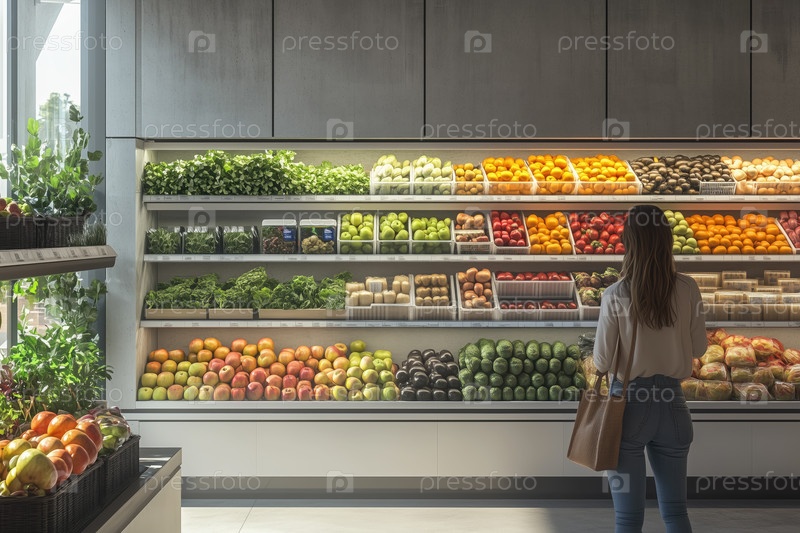 Изучение свежей продукции в современном продуктовом магазине