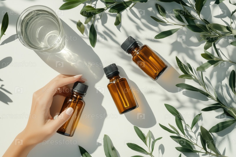 Устройство янтарных бутылок с зелеными листьями и стеклянной водой