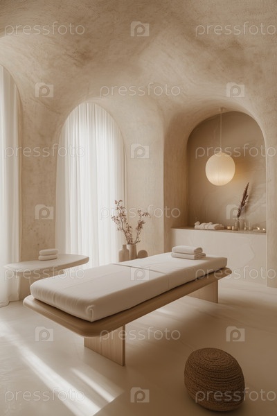 Спокойный интерьер спа-салона с мягким освещением и текстурами