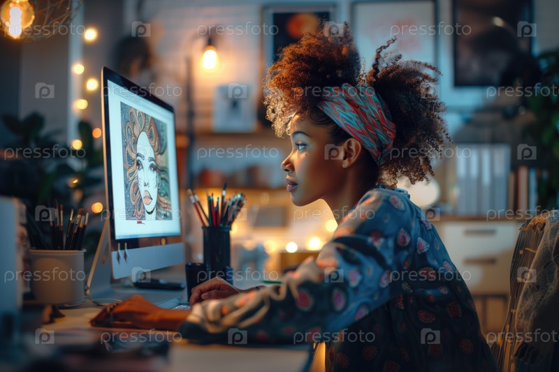 Молодой художник создает цифровую иллюстрацию ночью