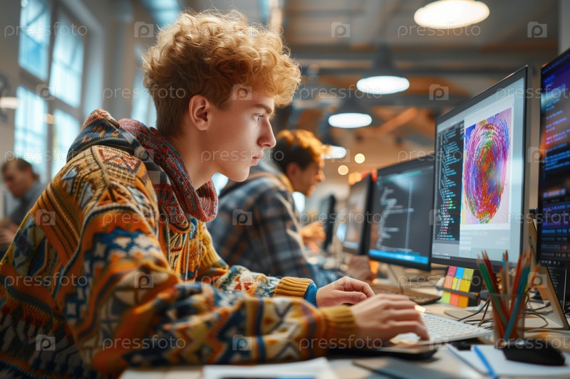 Молодой разработчик занимается программированием в современном офисе