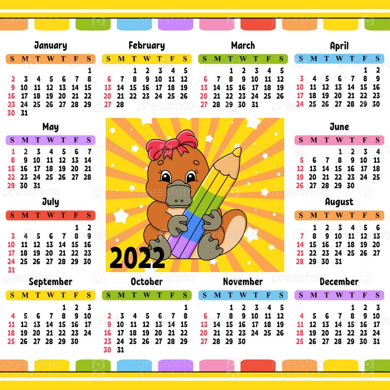 Календарь на 2022 год с милым персонажем. Веселый и яркий дизайн. Изолированная цветная векторная иллюстрация. Мультяшный стиль