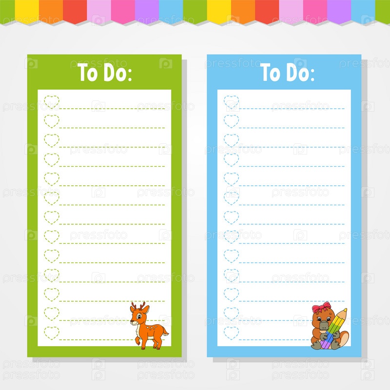 Список дел для детей. Пустой шаблон. Прямоугольная форма. Изолированная цветная векторная иллюстрация. Забавный персонаж. Мультяшный стиль. Для дневника, блокнота, закладки
