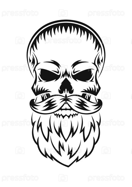 Человеческий череп с бородой и усами. Черный силуэт. Элемент дизайна. Нарисованный от руки эскиз. Винтажный стиль. Векторная иллюстрация