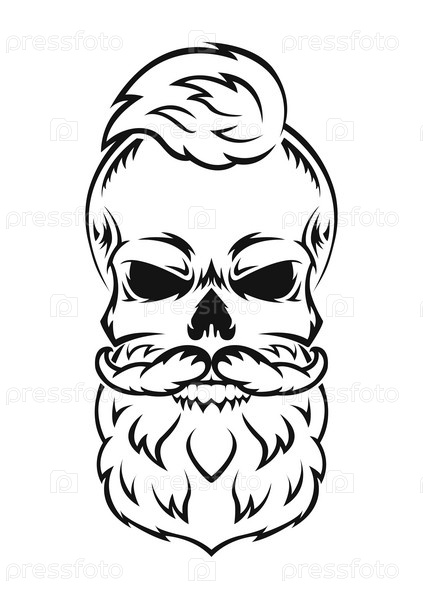 Человеческий череп с бородой и усами. Черный силуэт. Элемент дизайна. Нарисованный от руки эскиз. Винтажный стиль. Векторная иллюстрация