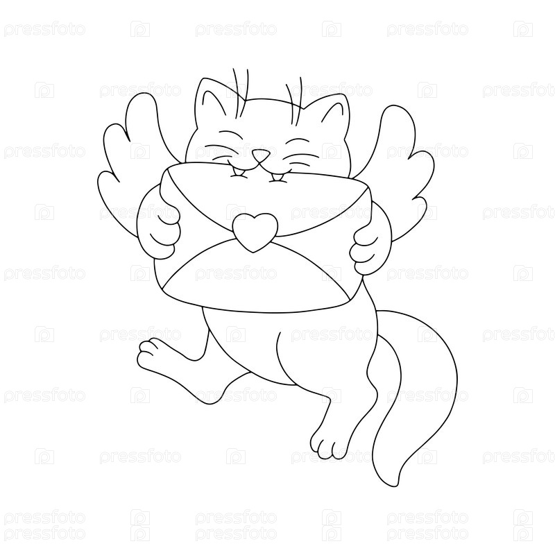 Любящий кот с крыльями. Страница раскраски для детей. Персонаж в мультяшном стиле. Векторная иллюстрация на белом фоне