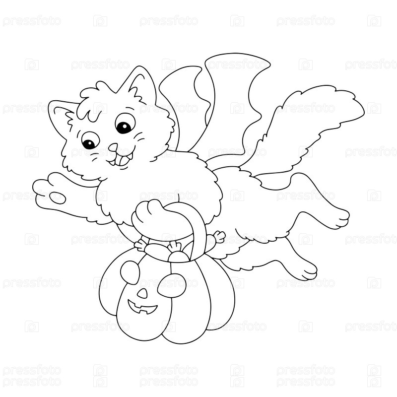 Милый кот несет в лапках тыкву со сладостями. Тема Хэллоуина. Раскраска для детей. Цифровая марка. Персонаж в мультяшном стиле. Векторная иллюстрация на белом фоне