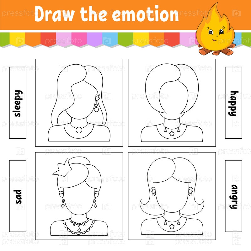 Нарисуй эмоцию. Рабочий лист заверши лицо. Раскраска для детей. Веселый персонаж. Векторная иллюстрация. Черный контурный силуэт. Изолирован на белом фоне