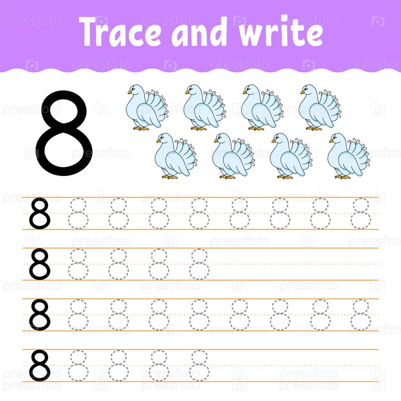 Изучайте цифры. Обводка и письмо. Практика письма. Образовательный развивающий рабочий лист. Цветная страница с заданиями. Изолированная векторная иллюстрация в милом мультяшном стиле