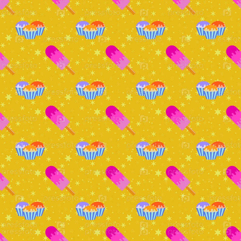 Цветной бесшовный узор вкусных пирожных и розового мороженого с глазурью. Простая плоская иллюстрация на оранжевом фоне с желтыми звездами