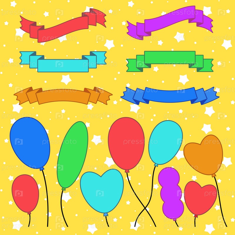 Набор плоских цветных силуэтов, изолированных лент, баннеров и воздушных шаров на желтом фоне. Простая плоская векторная иллюстрация. С местом для текста. Подходит для инфографики, дизайна, рекламы, фестивалей, этикеток