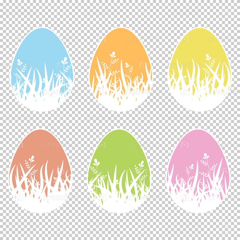 Набор цветных изолированных пасхальных яиц. С силуэтами травы и листьев. На прозрачном фоне. Простая плоская векторная иллюстрация. Подходит для оформления открыток, рекламы, журналов, веб-сайтов