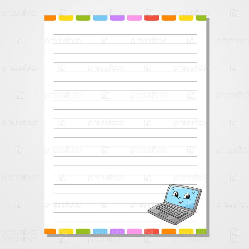 Шаблон листа для блокнота, записной книжки, дневника. Линованная бумага. Милый персонаж. С цветным изображением. Изолированная векторная иллюстрация. Мультяшный стиль