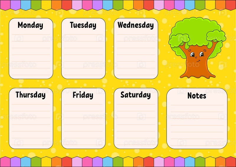 Расписание школы. Расписание для школьников. Пустой шаблон. Еженедельный планировщик с примечаниями. Изолированная цветная векторная иллюстрация. персонаж мультфильма