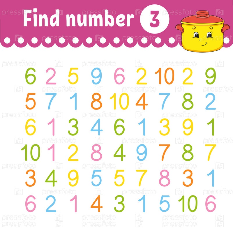 Найдите число. Образовательный развивающий рабочий лист. Страница с заданиями с картинками. Игра для детей. Забавный персонаж. Мультяшный стиль. Векторная иллюстрация