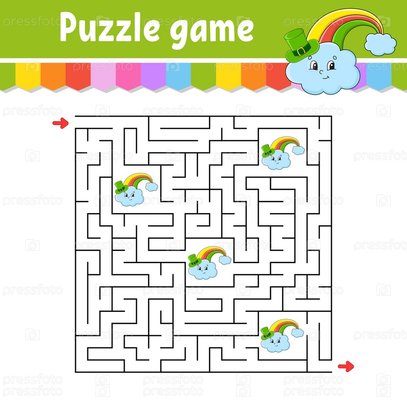 Квадратный лабиринт. Игра для детей. Головоломка для детей. Загадка лабиринта. Найдите правильный путь. Персонаж мультфильма. Векторная иллюстрация