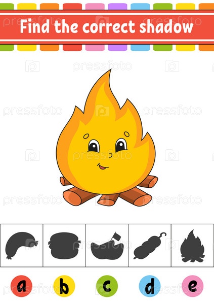 Найдите правильную тень. Рабочий лист по развитию образования. Страница с заданиями. Цветная игра для детей. Персонаж мультфильма. Векторная иллюстрация