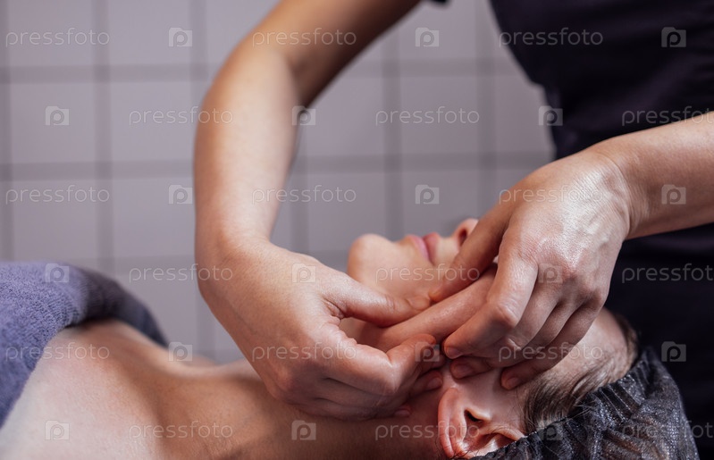 Портрет молодой привлекательной женщины крупным планом, получающей массаж лица