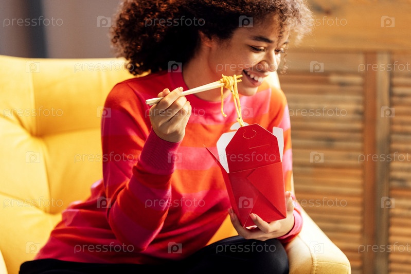Милая африканская женщина в свитере сидит в желтом кресле и ест лапшу палочками