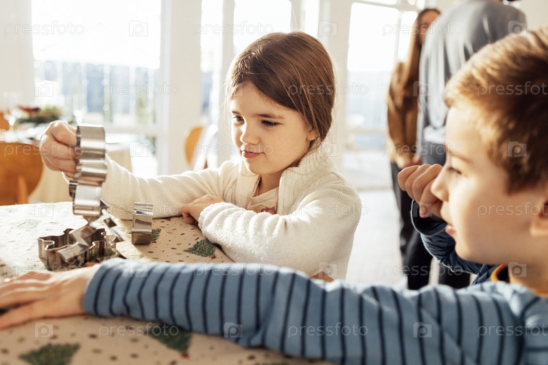 Милые дети на кухне помогают готовить рождественские пряники. Младший брат и сестра готовят вместе с родителями. Дети выбирают форму для печенья
