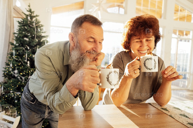 Пожилая супружеская пара наслаждается кофе дома. Пожилой мужчина с бородой и его милая жена смеются и пьют молочный напиток в гостиной