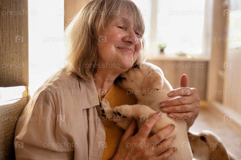 Зрелая женщина в повседневной одежде обнимает щенка дома. Питомец лижет лицо хозяина. Пенсионерка заботится о маленьком лабрадоре