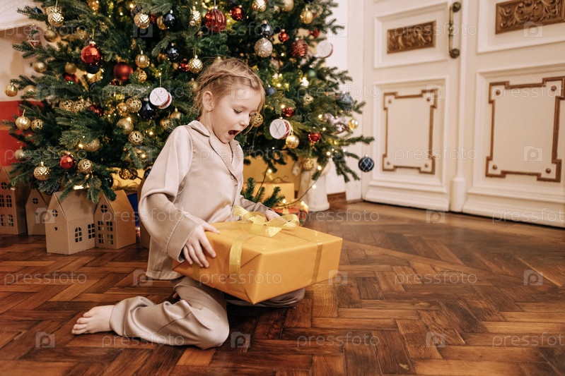 Маленькая удивленная девочка в пижаме открывает свой рождественский подарок. Милый маленький ребенок с праздничной коробкой дома под елкой