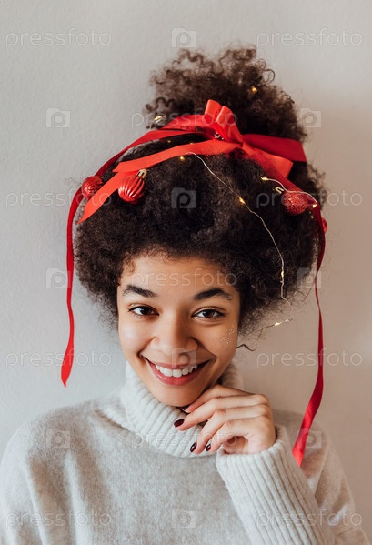 Крупный план молодой африканки с кудрявой прической, украшенной красной лентой, гирляндой и рождественскими шарами