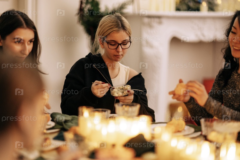 Молодые очаровательные девушки за празднично накрытым столом в гостиной. Девочка-подросток в очках ест вкусное блюдо