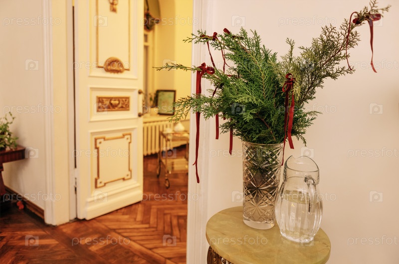 Рождественский декор в стильном богатом интерьере отеля. Декорированные веточки туи в стеклянной вазе на журнальном столике в холле